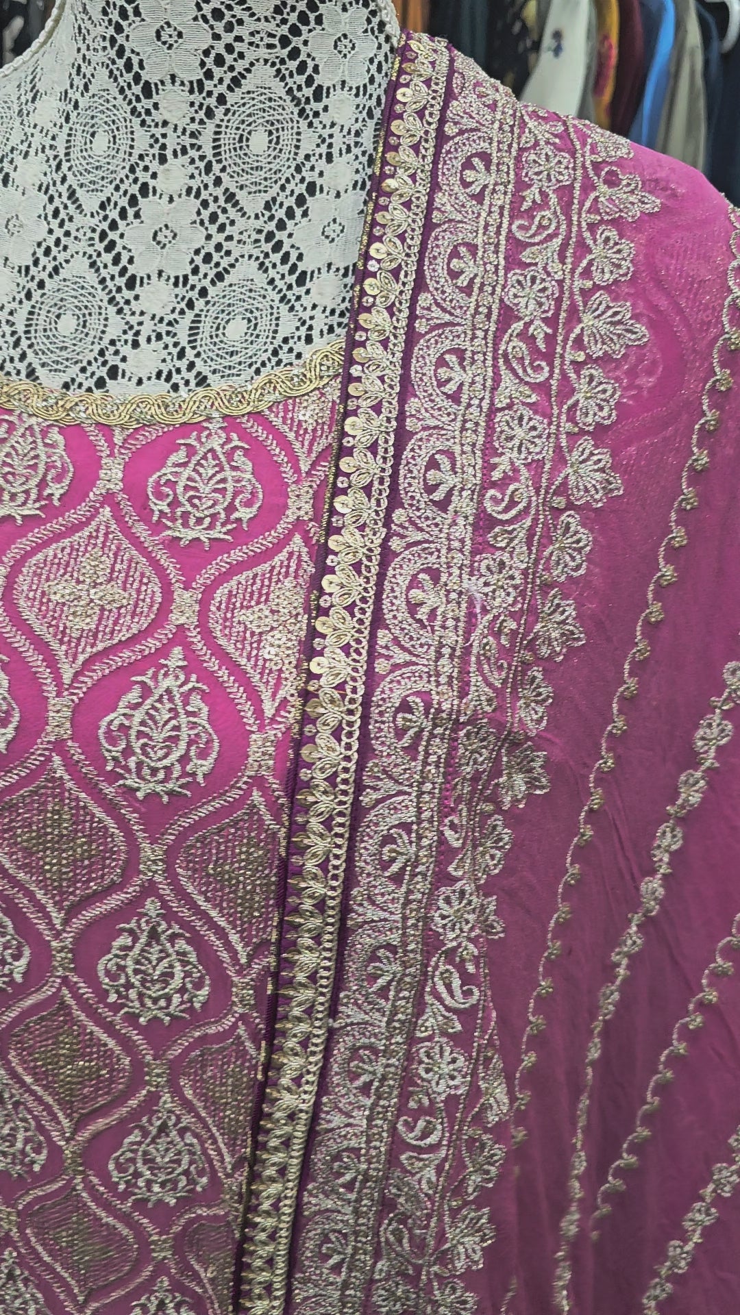 * Sharara: A rich contrast is provided by the pure plum Banarasi sharara, showcasing a heavy gold brocade pattern and a detailed border that adds regal volume and flair.